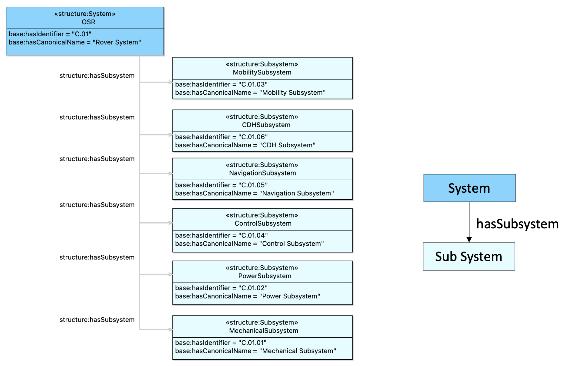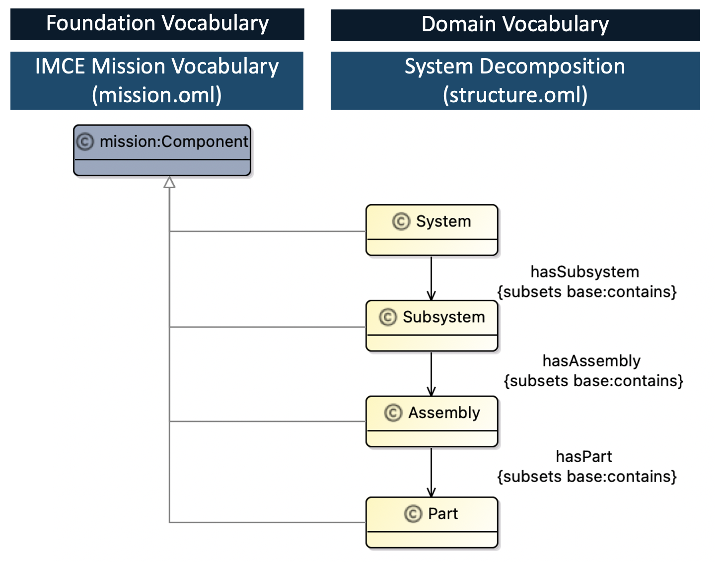 We defined the domain specific vocabularies to describe the OSR system decomposition. We defined “System”, “Subsystem” and “Assembly” concepts as a specialization of a mission:Component as shown in Figure 1.1.